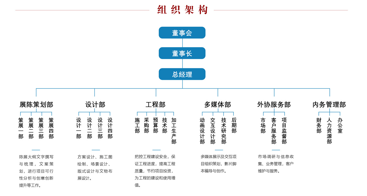 公司注重队伍建设和人才培养优化,拥有政治素养、艺术素养、人文素养兼备的设计团队和经验丰富、技能精湛、管理优良的项目施工团队。经过多年的工程实践,公司已和多家国内一流的博物馆相关产品和技术供应企业(展柜、灯光、多媒体、沙盘模型、语音导览等)以及多位国内一流艺术家(雕塑、绘画等)建立了长久牢固的合作关系。